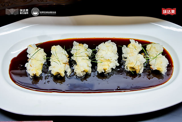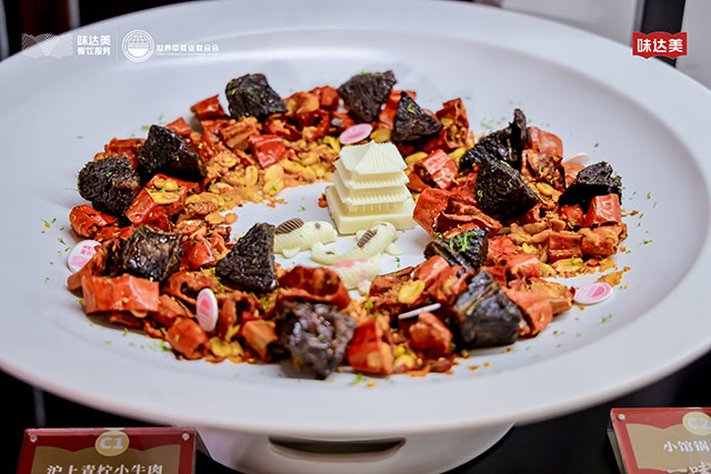 以江南文火小牛肉为灵感,将酱汁改成怪味,上面撒上青柠皮,滋味清新。选用牛肋骨为主料,撒少许盐,蒸制 1 小时,去骨后切块,八成油温炸制 3-4 分钟。制作脆皮牛肉汁,用味达美冰糖老抽酱油、味达美味极鲜酱油、黑胡椒碎、豆蔻,以及放入烤箱烤干的西红柿等,小火熬 2 分钟,煮至汁水略微浓稠。摆盘时搭配黄飞红香脆椒,口感酥脆,味道香浓。用白巧克力制作宝塔和锦鲤,用翻糖制作味达美和世界中餐业联合会的标志,点缀其间。
