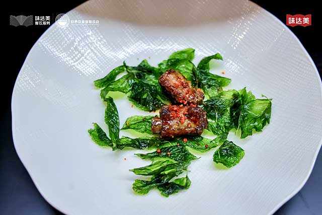薄荷独特的清新香气与排骨的肉香相互交融,清爽雅致,不仅中和了油腻感,还为菜肴增添别样的风味,让人回味无穷。排骨切成寸段,加入味达美金字蚝油、味达美尚品料酒、葱姜、大料,以及味达美冰糖老抽酱油,起到上色作用,用高压锅压制 15 分钟,捞出后拍少许淀粉,六成油温炸至上色。注意熬汁时,切忌太稠太咸,达到刚好挂汁的状态,如雨过天晴,若有似无,即为正好。顶部点缀黄飞红碎碎椒,解腻增香。排骨咸鲜,回味微甜,伴随椒香。摆盘时搭配炸好的薄荷叶,增添一抹盎然绿意。